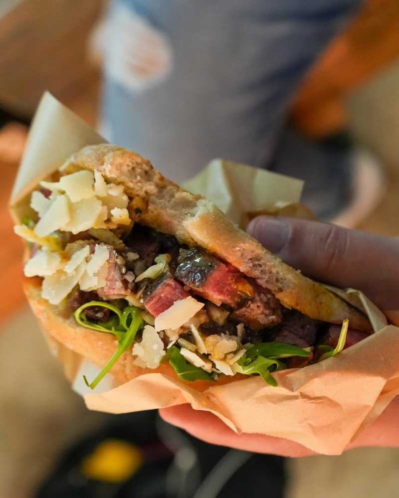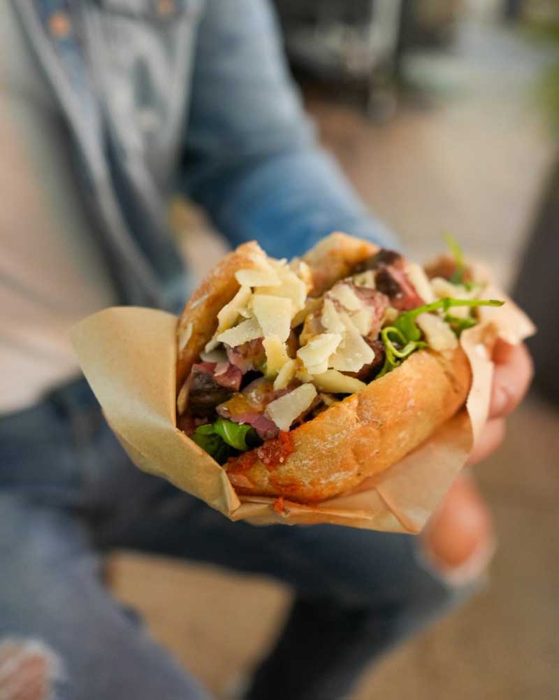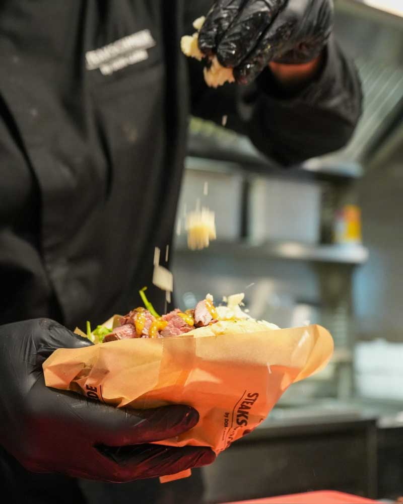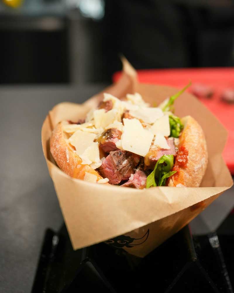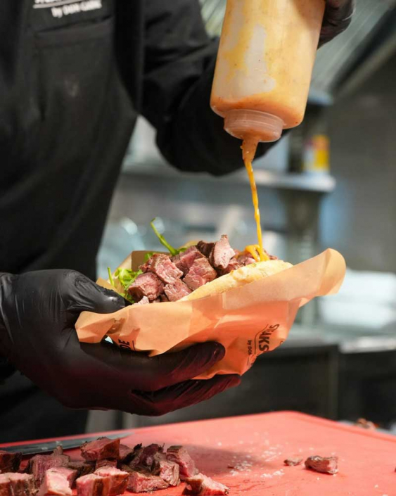 Das Düsseldorfer Original-Steaksandwich: preisgekrönt, einzigartig und im Geschmack unvergesslich. Außen knuspriges Brötchen aus der Manufaktur, innen bestes, frisch gegrilltes Flanksteak, abgerundet mit hausgemachten Saucen nach eigener Rezeptur. Hier treffen hochwertige Zutaten, reine Grillkunst und Liebe zum Geschmack aufeinander – das Steakschmiede Sandwich, eine virale Sensation mit Auszeichnung.